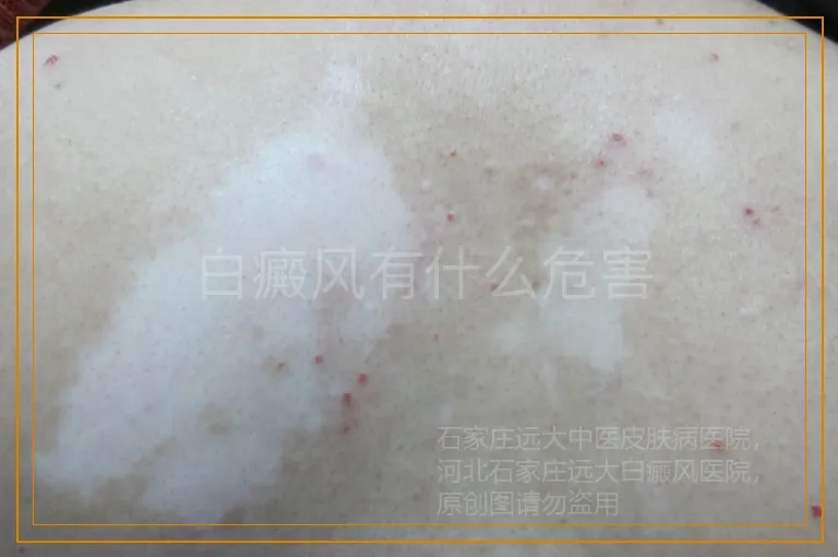 如果白癜风累及虹膜,造成虹膜中的色素减少,则容易形面白内障等眼科疾病,较重的患者会伴发毛发 变白。如果得不到及时治疗,进一步发展为全身性大面积白癜风的话,可导致排汗不畅,皮肤细胞代谢紊乱 ,有可能诱发其他疾病。
